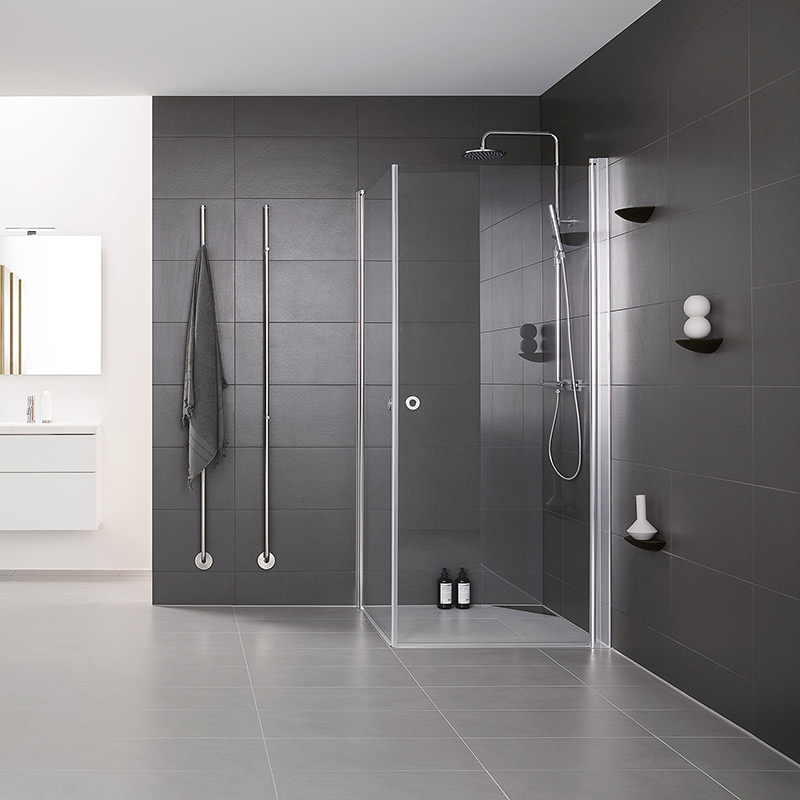 Duschvägg INR Linc Angel, en duschhörna med två raka, invikningsbara dörrar i 6 mm glas. Finns i fasta standardmått som du kan kombinera fritt. Detta svensktillverkade duschhörn kan vinklas in mot väggen när den inte används för att frigöra golvyta i badrummet. Med sparsmakad design och enkel konstruktion är Linc Angel en duschhörna som ger badrummet och duschutrymmet en större och luftigare känsla. Linc Angel är en av INRs mest älskade duschmodeller som tack vare lyftgångjärnet lyfter 7 mm i öppet läge.